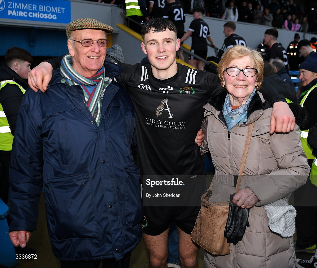 31 January 2026; Nenagh CBS captain Eoghan Doughan and his grandparents Sean and Theresa Doughan after the Dr Harty Cup final match between St Flannans College and St Joseph's CBS at Zimmer Biomet Páirc Chíosóg in Ennis, Clare. Photo by John Sheridan/Sportsfile