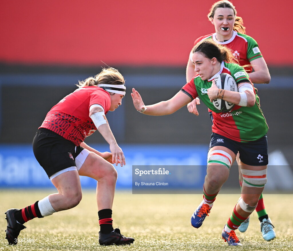 25 January 2026; Annakate Cournane of Clovers in action against Hannah Bluck of Brython Thunder during the Celtic Challenge Round 5 match between Clovers and Brython Thunder at Virgin Media Park in Cork. Photo by Shauna Clinton/Sportsfile