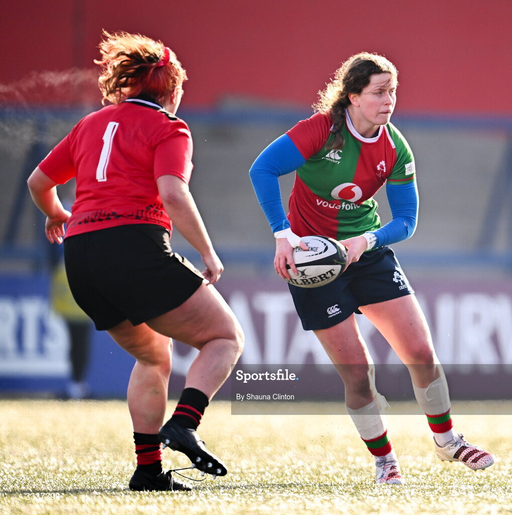 25 January 2026; Caitríona Finn of Clovers in action against Stella Orrin of Brython Thunder during the Celtic Challenge Round 5 match between Clovers and Brython Thunder at Virgin Media Park in Cork. Photo by Shauna Clinton/Sportsfile