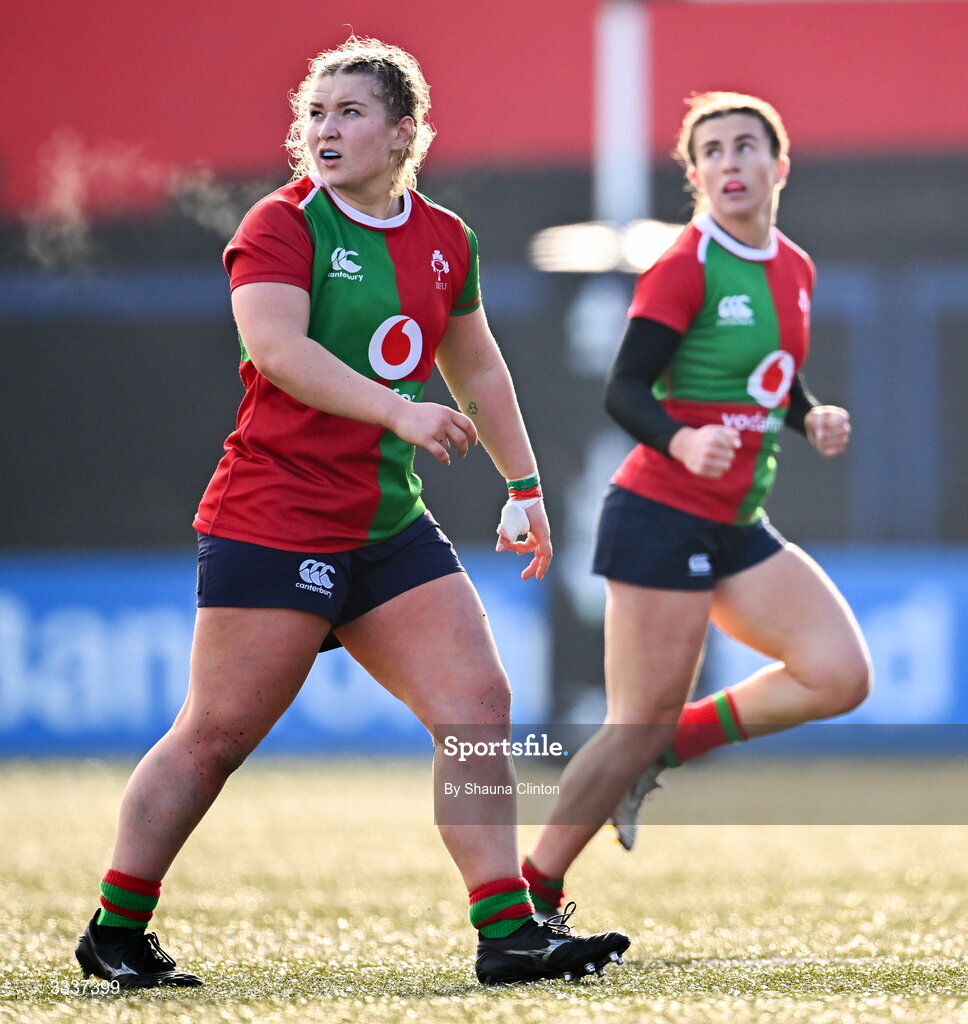 25 January 2026; Sadhbh McGrath of Clovers, left, and Emily Lane of Clovers during the Celtic Challenge Round 5 match between Clovers and Brython Thunder at Virgin Media Park in Cork. Photo by Shauna Clinton/Sportsfile