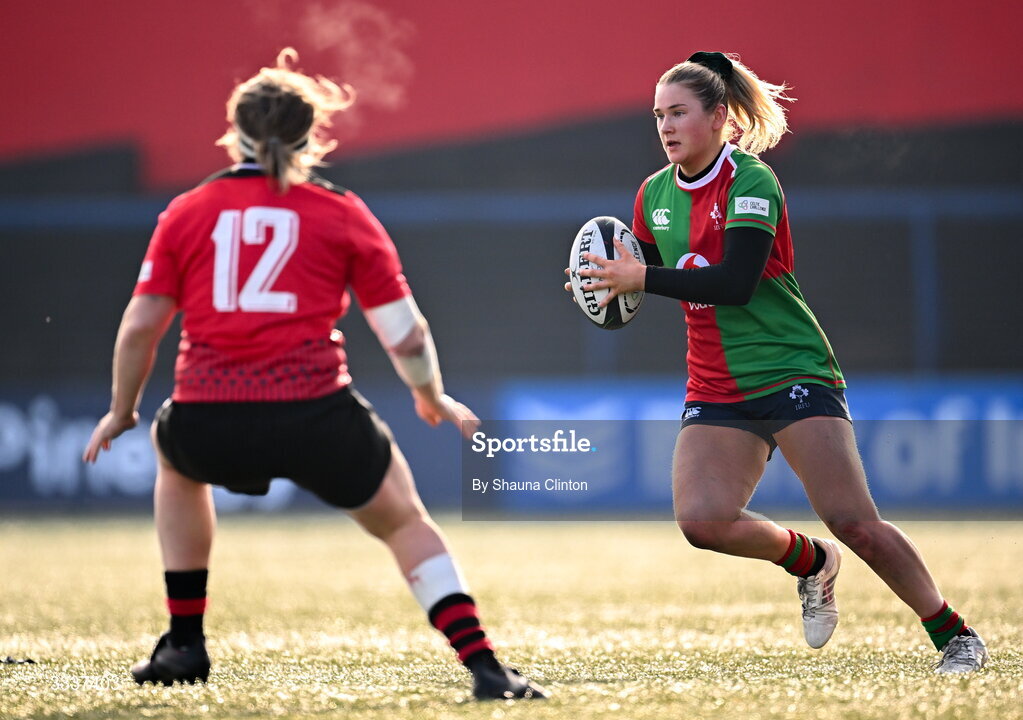 25 January 2026; Aoife Corey of Clovers in action against Hannah Bluck of Brython Thunder during the Celtic Challenge Round 5 match between Clovers and Brython Thunder at Virgin Media Park in Cork. Photo by Shauna Clinton/Sportsfile
