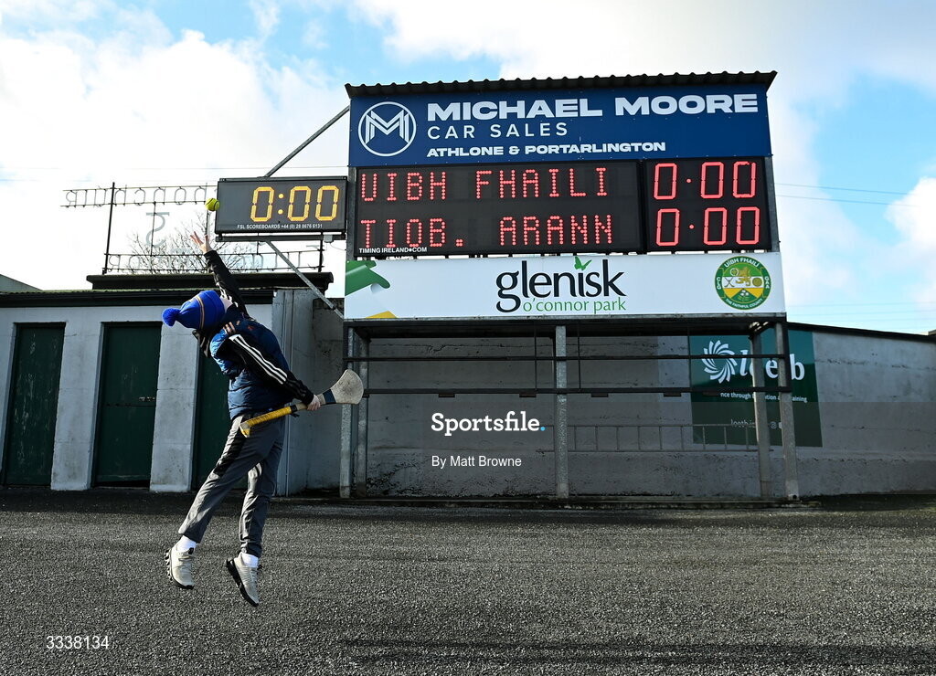 1 February 2026; 11 year old Tipperary supporter Kian Delaney from Roscrea before the Allianz Hurling League Division 1A match between Offaly and Tipperary at Glenisk O'Connor Park in Tullamore, Offaly. Photo by Matt Browne/Sportsfile