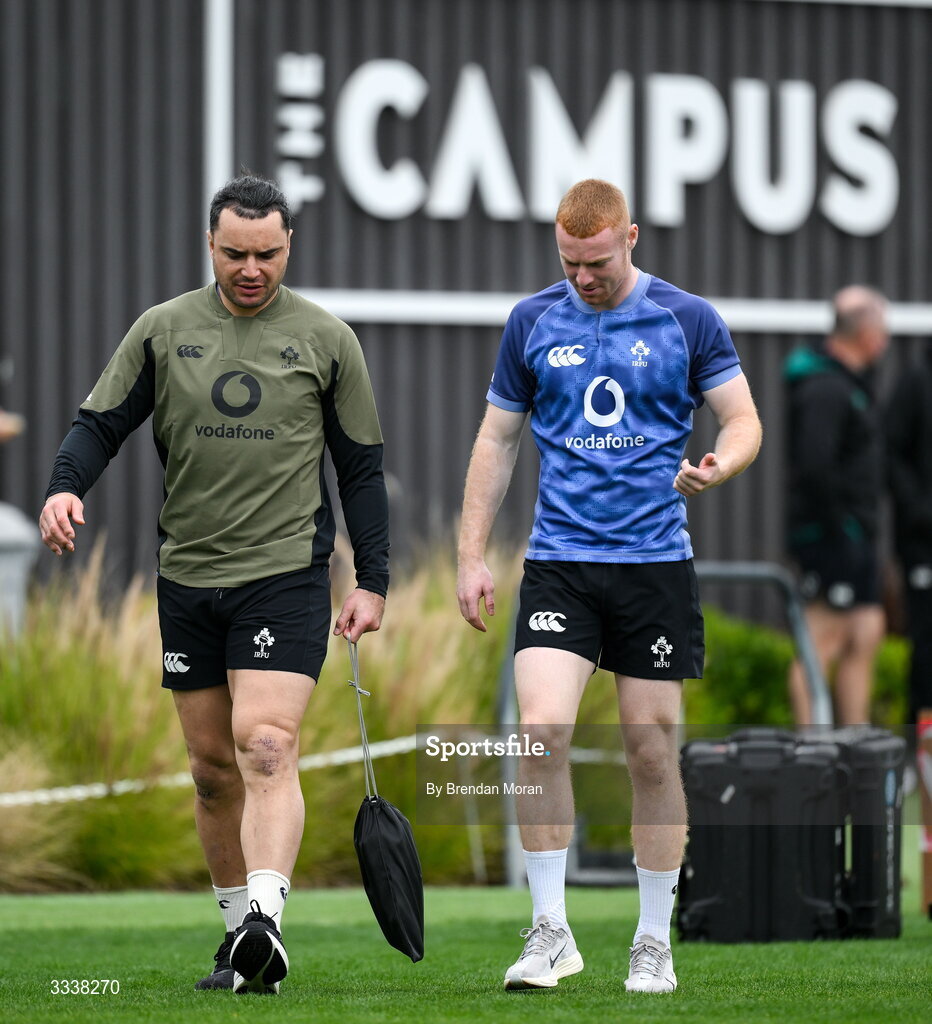 1 February 2026; James Lowe, left, and Nathan Doak arrives for an Ireland Rugby squad training session at The Campus in Quinta do Lago, Portugal. Photo by Brendan Moran/Sportsfile