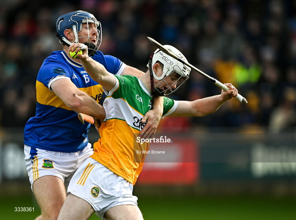 1 February 2026; Brecon Kavanagh of Offaly in action against Josh Keller of Tipperary during the Allianz Hurling League Division 1A match between Offaly and Tipperary at Glenisk O'Connor Park in Tullamore, Offaly. Photo by Matt Browne/Sportsfile