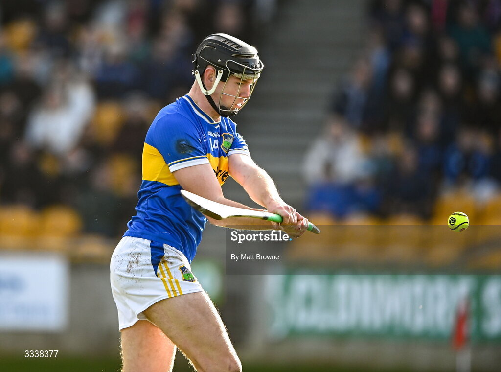 1 February 2026; Paddy McCormack of Tipperary scores the first goal against Offaly during the Allianz Hurling League Division 1A match between Offaly and Tipperary at Glenisk O'Connor Park in Tullamore, Offaly. Photo by Matt Browne/Sportsfile