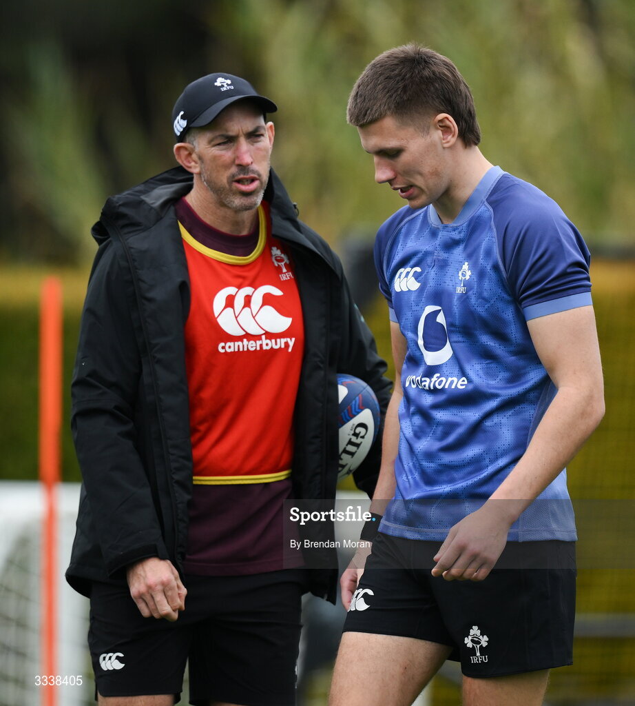 1 February 2026; Sam Prendergast, right, and assistant coach Andrew Goodman during an Ireland Rugby squad training session at The Campus in Quinta do Lago, Portugal. Photo by Brendan Moran/Sportsfile