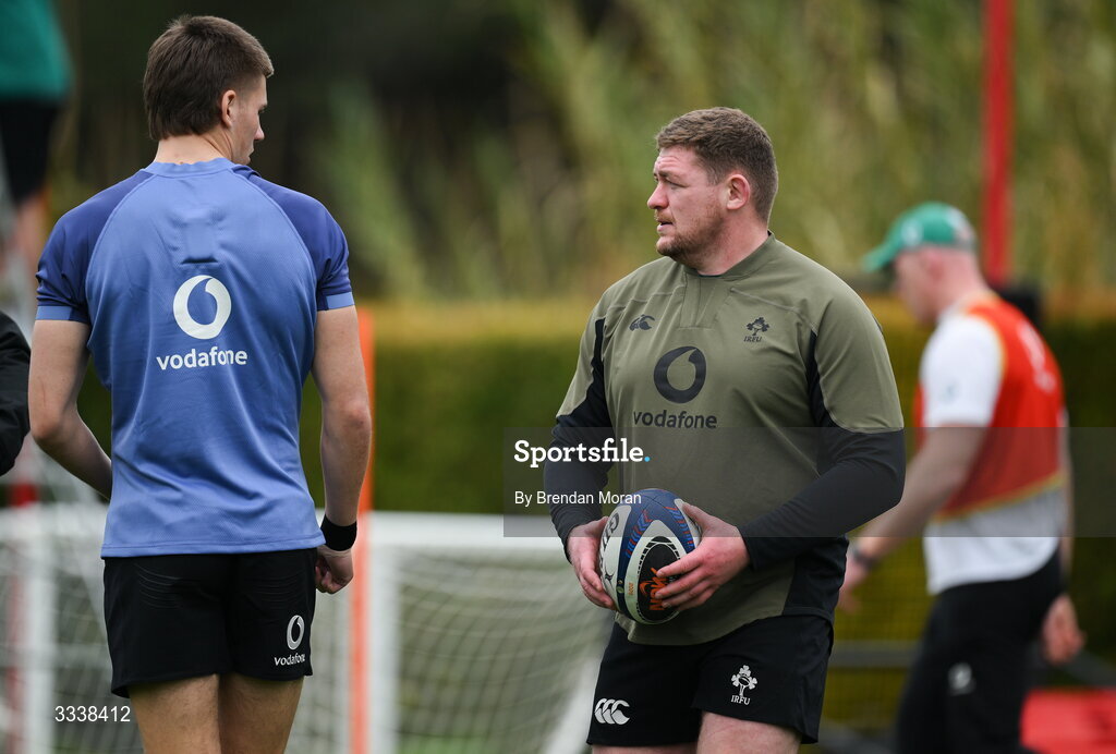 1 February 2026; Tadhg Furlong, right, and Sam Prendergast during an Ireland Rugby squad training session at The Campus in Quinta do Lago, Portugal. Photo by Brendan Moran/Sportsfile