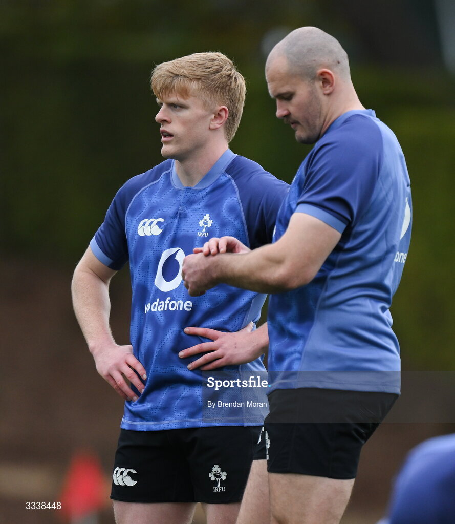 1 February 2026; Tommy O'Brien, left, and Jacob Stockdale during an Ireland Rugby squad training session at The Campus in Quinta do Lago, Portugal. Photo by Brendan Moran/Sportsfile