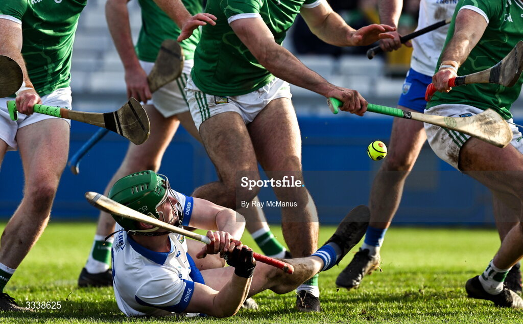 1 February 2026; Michael Kiely of Waterford has a shot on goal during the Allianz Hurling League Division 1A match between Waterford and Limerick at Azzurri Walsh Park in Waterford. Photo by Ray McManus/Sportsfile