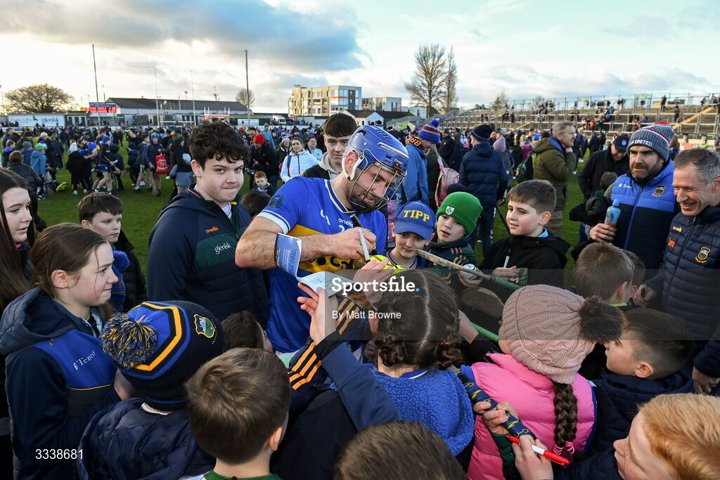 1 February 2026; John McGrath of Tipperary with supporters after the Allianz Hurling League Division 1A match between Offaly and Tipperary at Glenisk O'Connor Park in Tullamore, Offaly. Photo by Matt Browne/Sportsfile