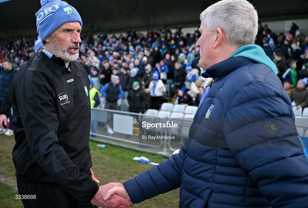 1 February 2026; Waterford manager Peter Queally and Limerick manager John Kiely shake hands after the Allianz Hurling League Division 1A match between Waterford and Limerick at Azzurri Walsh Park in Waterford. Photo by Ray McManus/Sportsfile