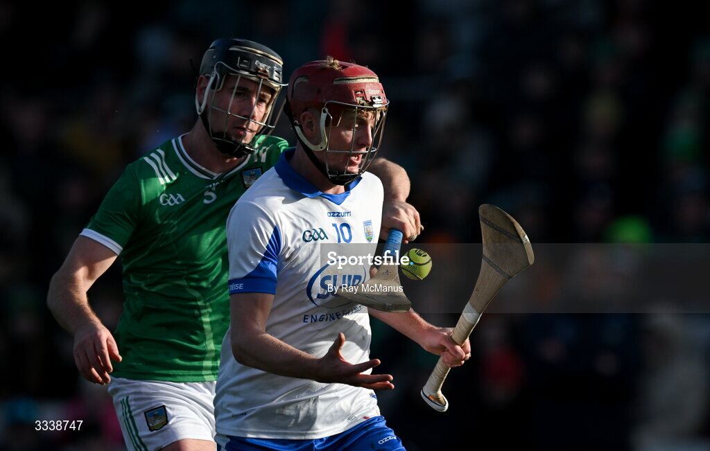 1 February 2026; Calum Lyons of Waterford is tackled by Diarmaid Byrnes of Limerick during the Allianz Hurling League Division 1A match between Waterford and Limerick at Azzurri Walsh Park in Waterford. Photo by Ray McManus/Sportsfile