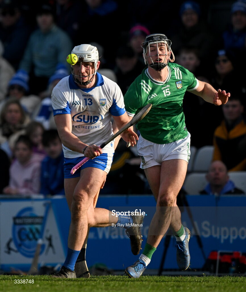 1 February 2026; Reuben Halloran of Waterford is tackled by Aidan O'Connor of Limerick during the Allianz Hurling League Division 1A match between Waterford and Limerick at Azzurri Walsh Park in Waterford. Photo by Ray McManus/Sportsfile