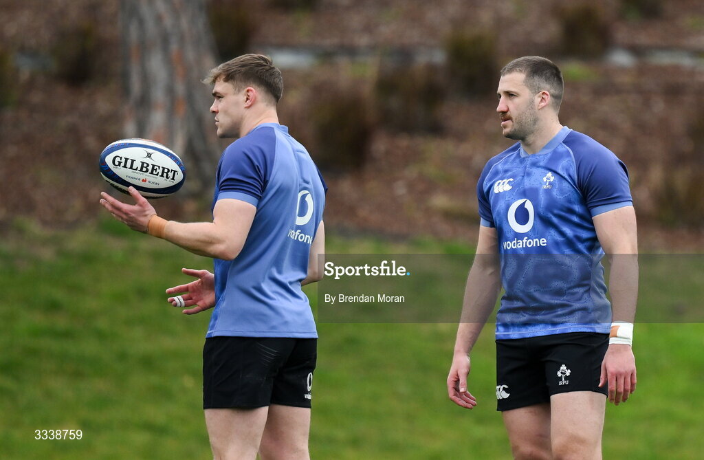 1 February 2026; Garry Ringrose, left, and Stuart McCloskey during an Ireland Rugby squad training session at The Campus in Quinta do Lago, Portugal. Photo by Brendan Moran/Sportsfile