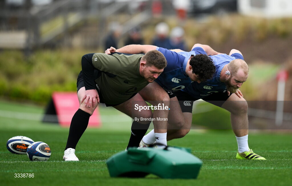 1 February 2026; Tadhg Furlong, Tom Stewart and Jeremy Loughman during an Ireland Rugby squad training session at The Campus in Quinta do Lago, Portugal. Photo by Brendan Moran/Sportsfile