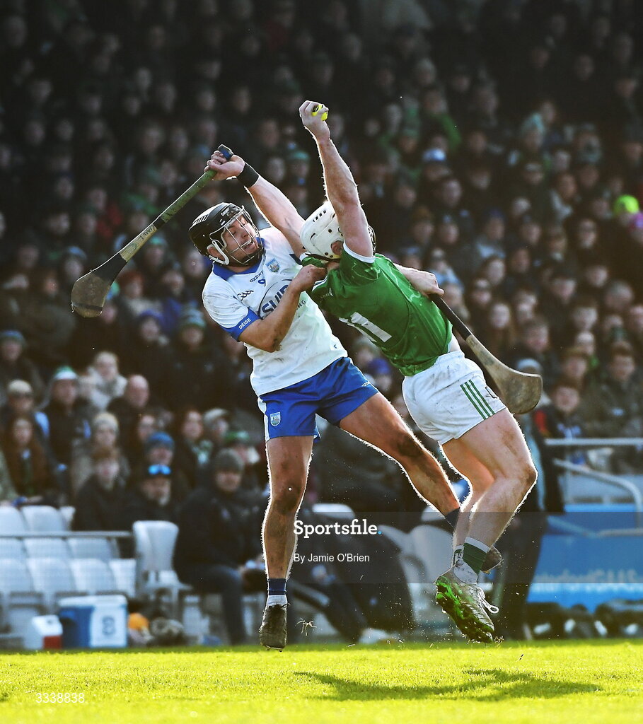 1 February 2026; Cian Lynch of Limerick catches the sliotar ahead of Darragh Lyons of Waterford during the Allianz Hurling League Division 1A match between Waterford and Limerick at Azzurri Walsh Park in Waterford. Photo by Jamie O'Brien/Sportsfile