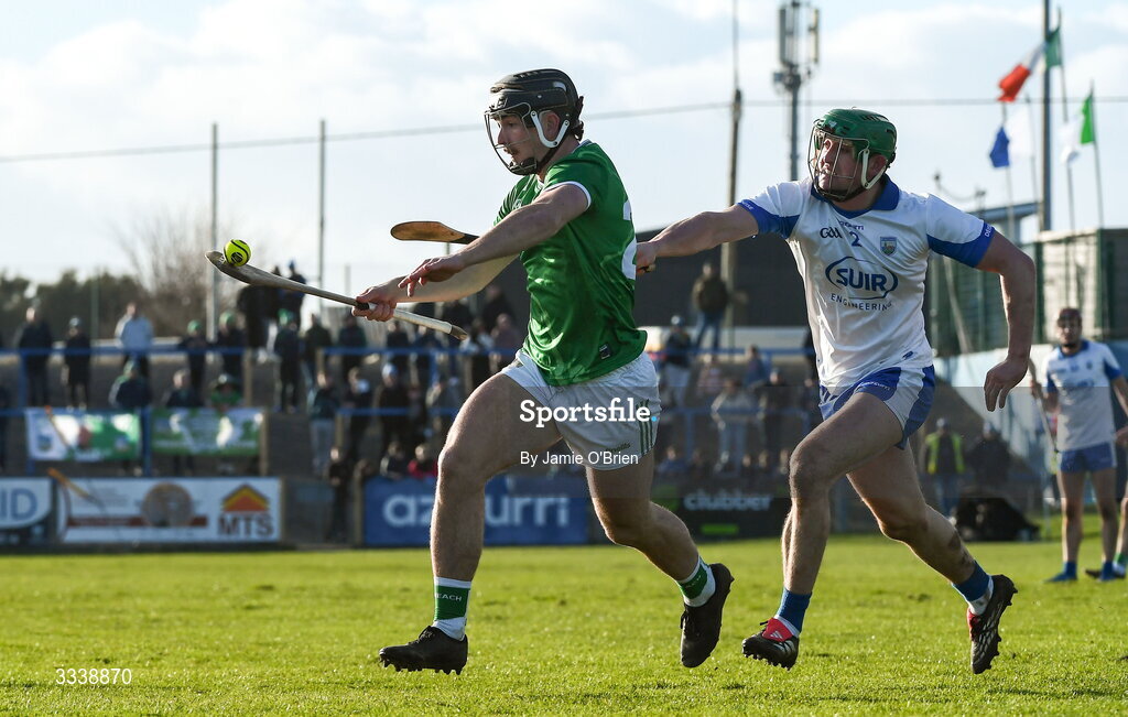 1 February 2026; Hugh Flanagan of Limerick is tackled by Mairtín Power of Waterford during the Allianz Hurling League Division 1A match between Waterford and Limerick at Azzurri Walsh Park in Waterford. Photo by Jamie O'Brien/Sportsfile