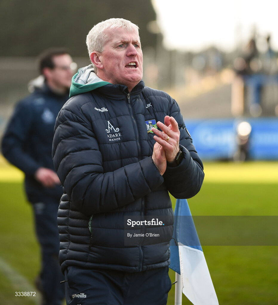 1 February 2026; Limerick manager John Kiely near the end of the Allianz Hurling League Division 1A match between Waterford and Limerick at Azzurri Walsh Park in Waterford. Photo by Jamie O'Brien/Sportsfile