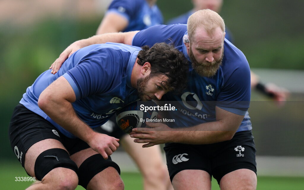 1 February 2026; Caelan Doris, left, and Jeremy Loughman during an Ireland Rugby squad training session at The Campus in Quinta do Lago, Portugal. Photo by Brendan Moran/Sportsfile