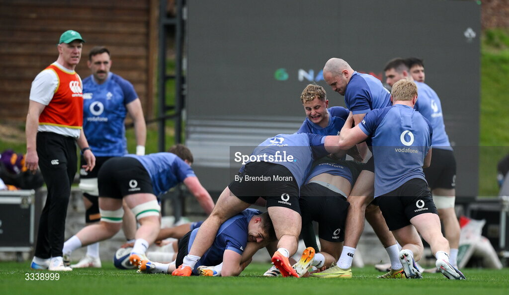 1 February 2026; Craig Casey and Jacob Stockdale during an Ireland Rugby squad training session at The Campus in Quinta do Lago, Portugal. Photo by Brendan Moran/Sportsfile
