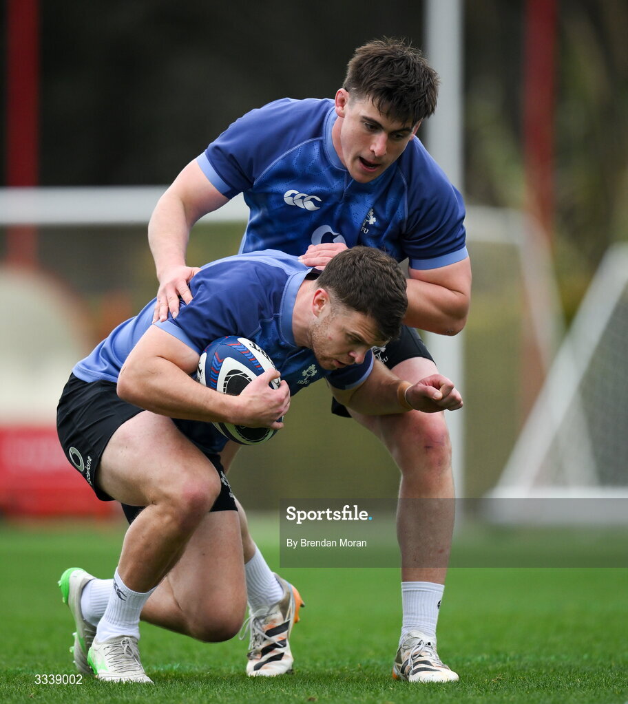 1 February 2026; Tom Farrell, left, and Dan Sheehan during an Ireland Rugby squad training session at The Campus in Quinta do Lago, Portugal. Photo by Brendan Moran/Sportsfile