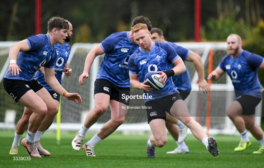1 February 2026; Ciarán Frawley during an Ireland Rugby squad training session at The Campus in Quinta do Lago, Portugal. Photo by Brendan Moran/Sportsfile