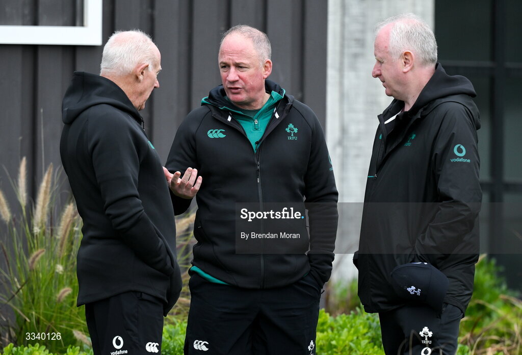 1 February 2026; IRFU performance director David Humphreys, with team manager Mick Kearney, left, and team operations manager Ger Carmody during an Ireland Rugby squad training session at The Campus in Quinta do Lago, Portugal. Photo by Brendan Moran/Sportsfile