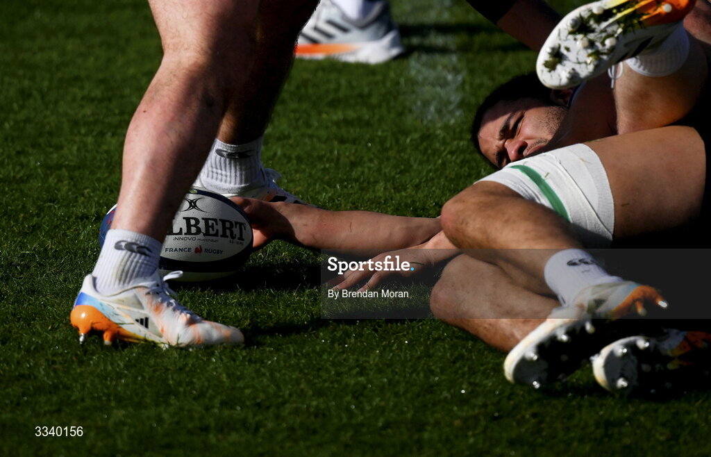 2 February 2026; Cormac Izuchukwu in a ruck during an Ireland Rugby squad training session at The Campus in Quinta do Lago, Portugal. Photo by Brendan Moran/Sportsfile