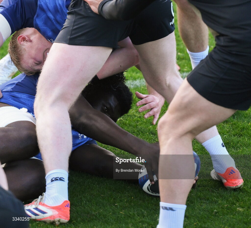 2 February 2026; Jamie Osborne, left, and Edwin Edogbo during an Ireland Rugby squad training session at The Campus in Quinta do Lago, Portugal. Photo by Brendan Moran/Sportsfile