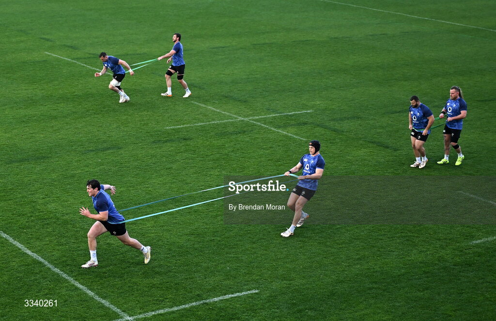 2 February 2026; Tom Stewart, left, and Josh van der Flier during an Ireland Rugby squad training session at The Campus in Quinta do Lago, Portugal. Photo by Brendan Moran/Sportsfile