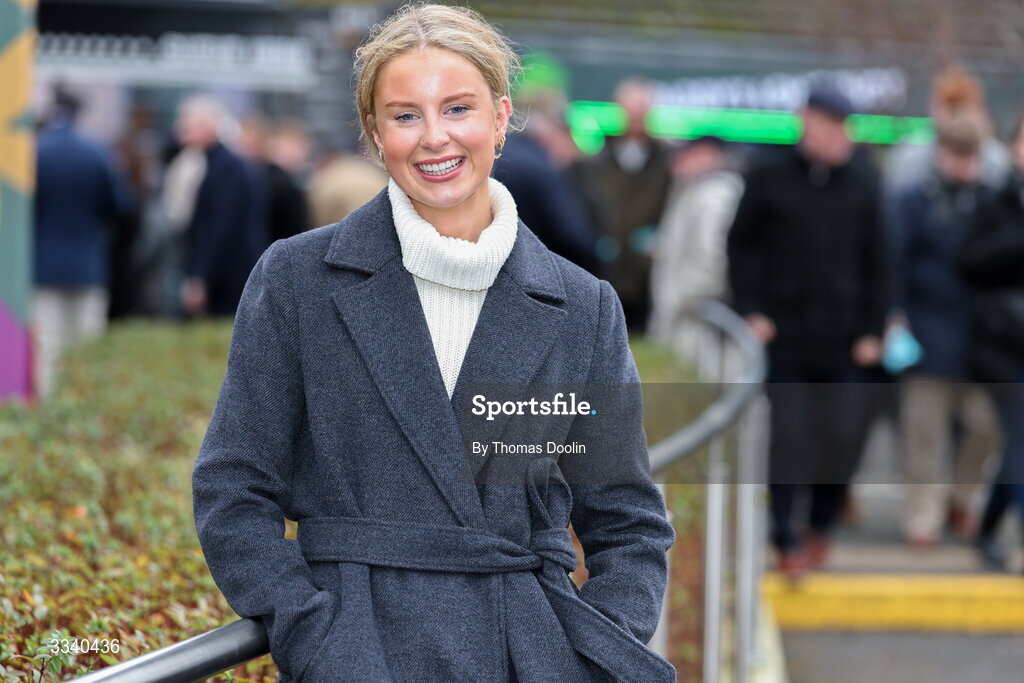 2 February 2026; Racegower Grace Barry from Dunboyne Co. Meath during day two of the Dublin Racing Festival at Leopardstown Racecourse in Dublin. Photo by Thomas Doolin/Sportsfile