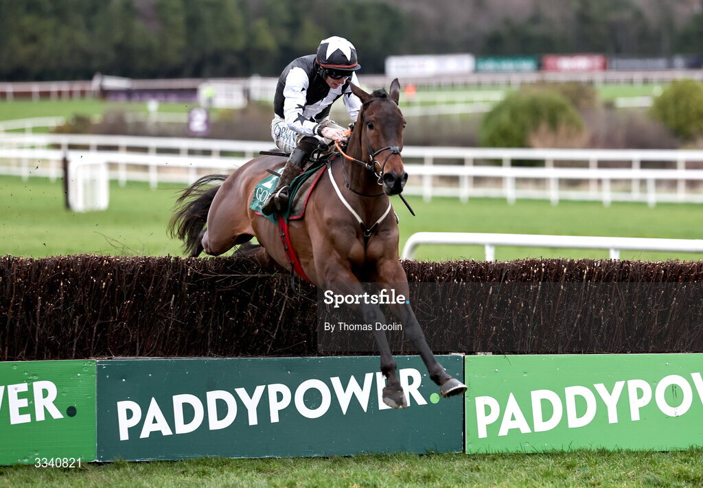 2 February 2026; Romeo Coolio, with Jack Kennedy up, jump the last on their way to winning the Goffs Irish Arkle Novice Steeplechase during day two of the Dublin Racing Festival at Leopardstown Racecourse in Dublin. Photo by Thomas Doolin/Sportsfile