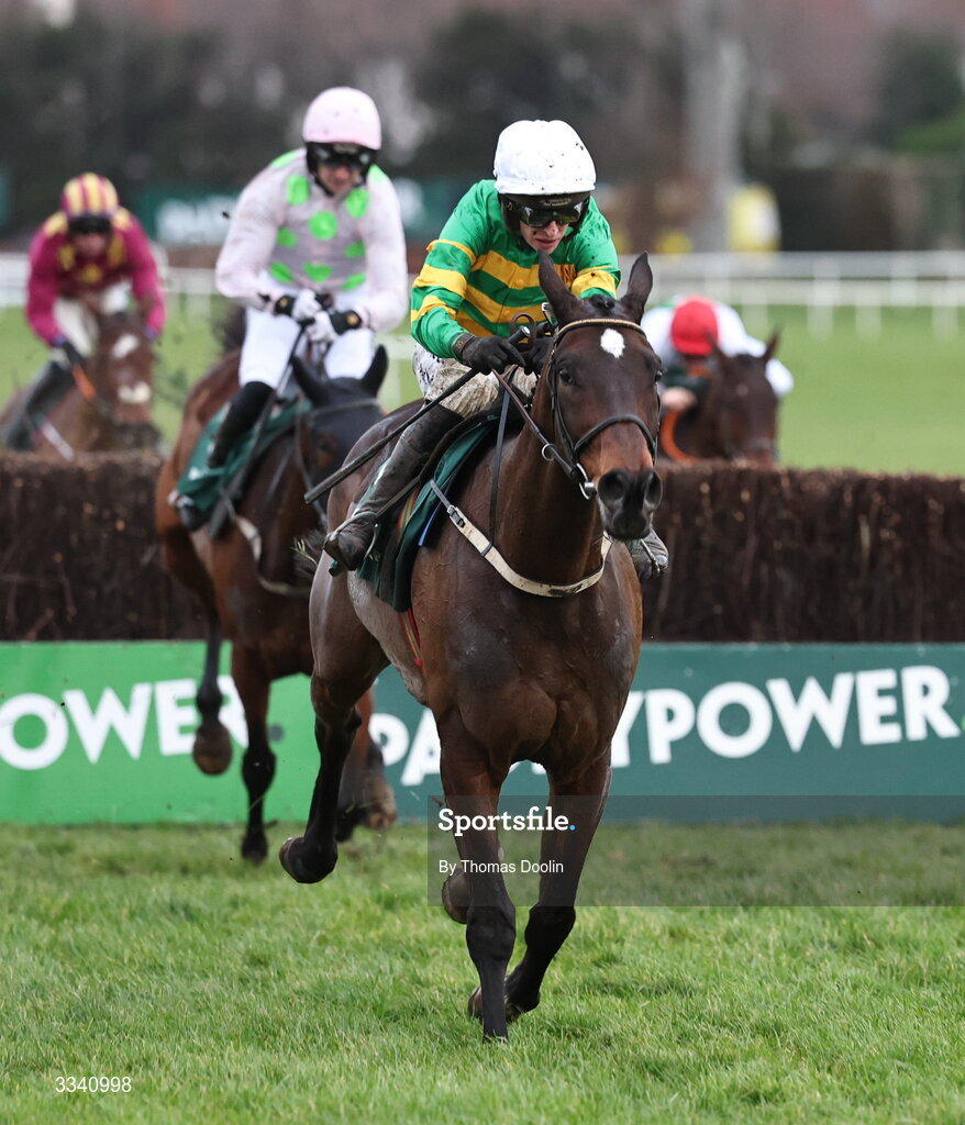 2 February 2026; Fact To File, with Mark Walsh up, on their way to winning the Paddy Power Irish Gold Cup during day two of the Dublin Racing Festival at Leopardstown Racecourse in Dublin. Photo by Thomas Doolin/Sportsfile