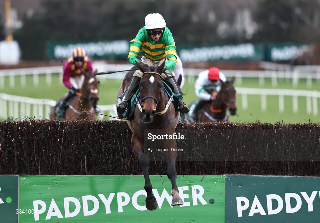 2 February 2026; Fact To File, with Mark Walsh up, jump the last on their way to winning the Paddy Power Irish Gold Cup during day two of the Dublin Racing Festival at Leopardstown Racecourse in Dublin. Photo by Thomas Doolin/Sportsfile