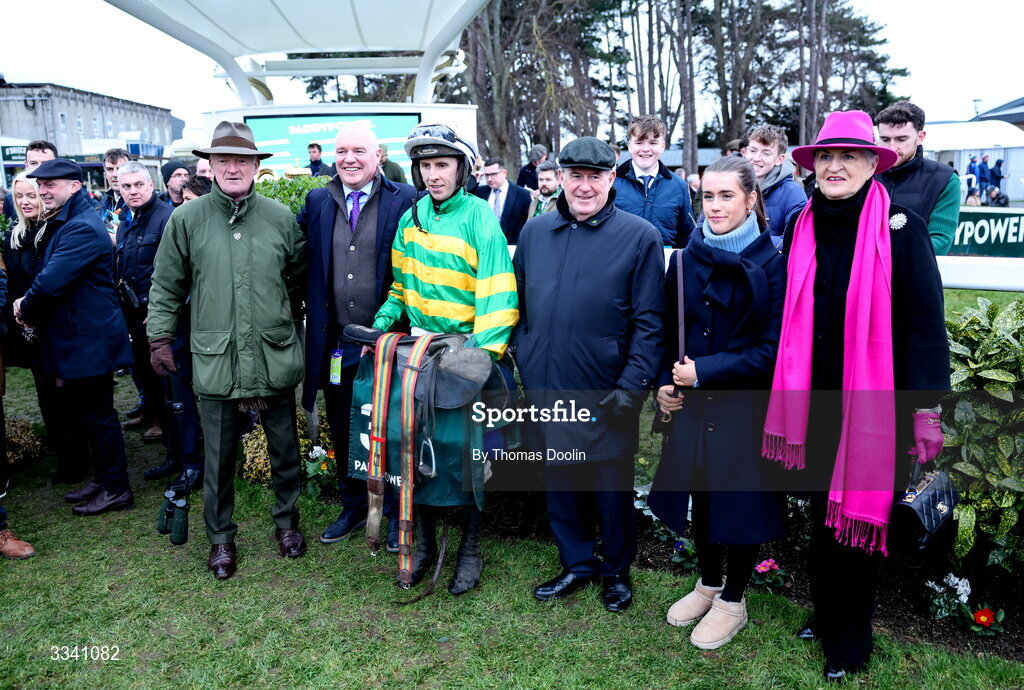 2 February 2026; Jockey Mark Walsh celebrates with winning connections, including owner JP McManus, third from right, and trainer Willie Mullins, left, after winning the Paddy Power Irish Gold Cup on Fact To File during day two of the Dublin Racing Festival at Leopardstown Racecourse in Dublin. Photo by Thomas Doolin/Sportsfile