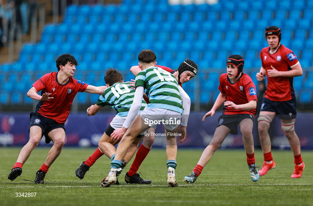 3 February 2026; Ultan Caulfield of CUS is tackled by Samuel Hegarty of St Gerard's School during the Bank of Ireland Leinster Rugby Boys Schools Junior Cup First Round match between CUS and St Gerard's School at Energia Park in Dublin. Photo by Thomas Flinkow/Sportsfile