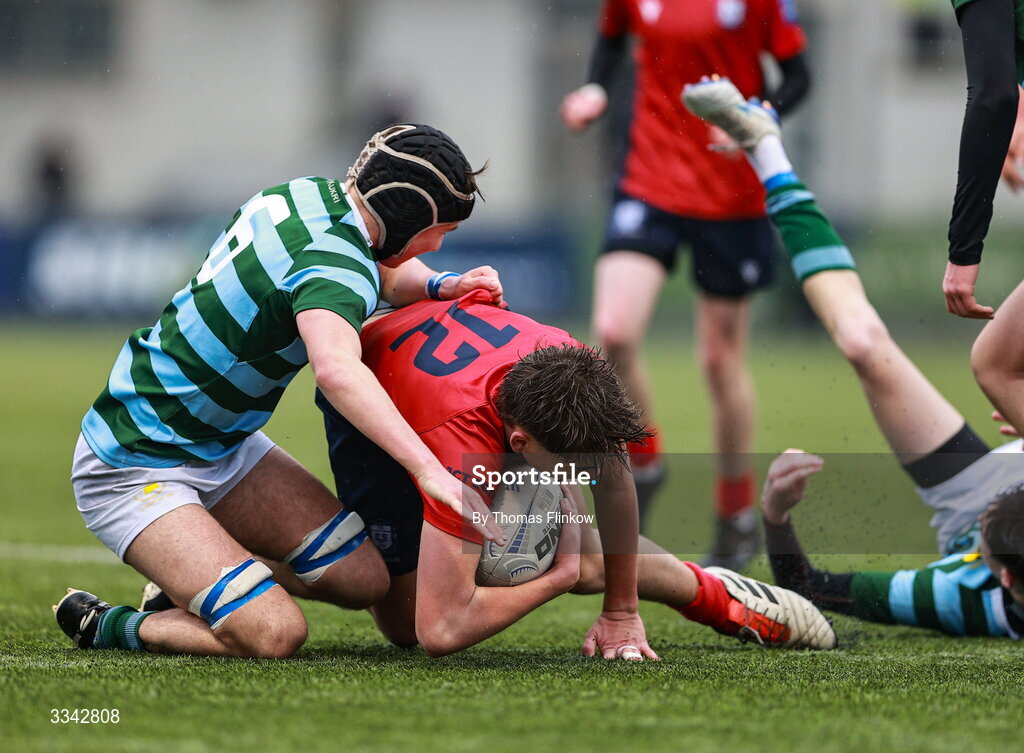 3 February 2026; Eli Vukovic of CUS is tackled by Jules Jackson Pratt of St Gerard's School during the Bank of Ireland Leinster Rugby Boys Schools Junior Cup First Round match between CUS and St Gerard's School at Energia Park in Dublin. Photo by Thomas Flinkow/Sportsfile