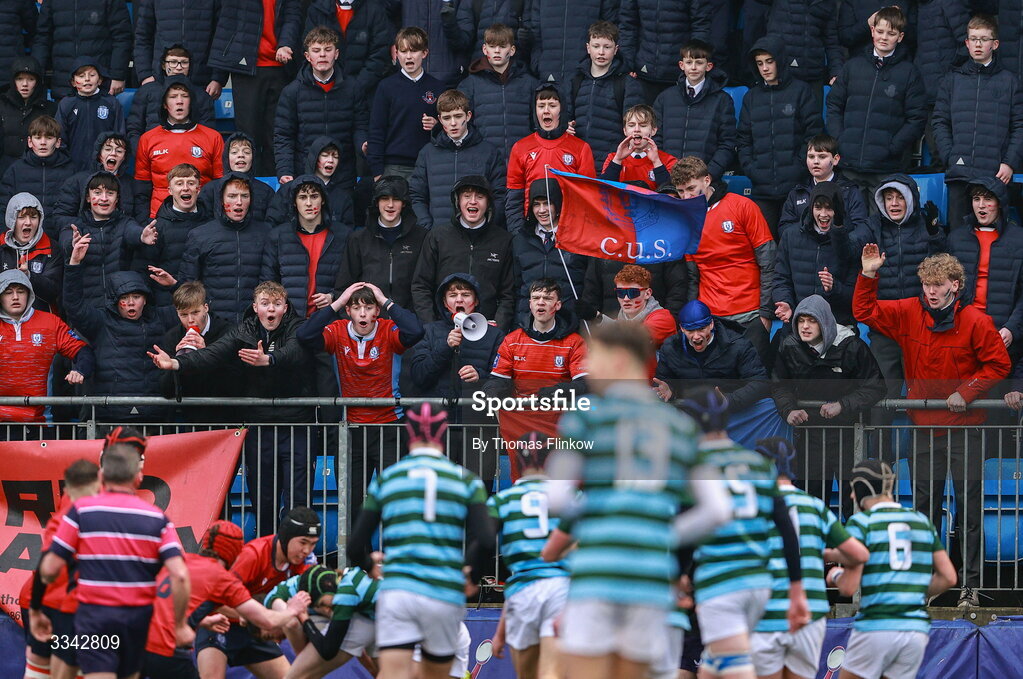 3 February 2026; CUS supporters during the Bank of Ireland Leinster Rugby Boys Schools Junior Cup First Round match between CUS and St Gerard's School at Energia Park in Dublin. Photo by Thomas Flinkow/Sportsfile