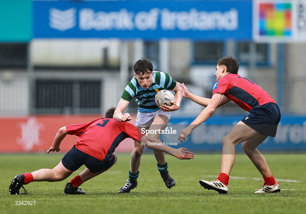 3 February 2026; Ben Willis of St Gerard's School in action against CUS players, from left, Finn Mullarkey and Eli Vukovic during the Bank of Ireland Leinster Rugby Boys Schools Junior Cup First Round match between CUS and St Gerard's School at Energia Park in Dublin. Photo by Thomas Flinkow/Sportsfile