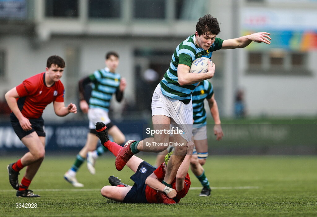 3 February 2026; Stephen Quinn of St Gerard's School is tackled by Joe Morrissey of CUS during the Bank of Ireland Leinster Rugby Boys Schools Junior Cup First Round match between CUS and St Gerard's School at Energia Park in Dublin. Photo by Thomas Flinkow/Sportsfile
