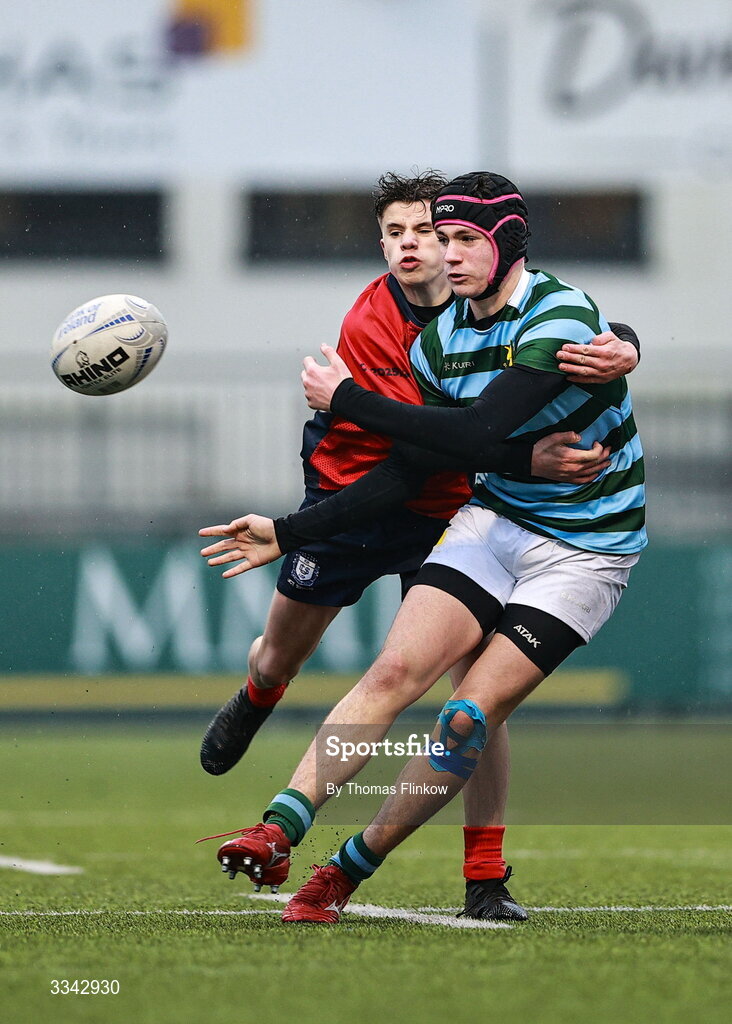 3 February 2026; Charlie Moes of St Gerard's School is tackled by Darragh Reid of CUS during the Bank of Ireland Leinster Rugby Boys Schools Junior Cup First Round match between CUS and St Gerard's School at Energia Park in Dublin. Photo by Thomas Flinkow/Sportsfile