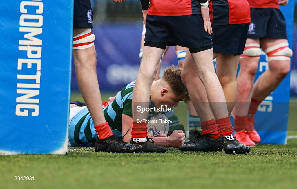 3 February 2026; Zack O'Dwyer of St Gerard's School scores a try during the Bank of Ireland Leinster Rugby Boys Schools Junior Cup First Round match between CUS and St Gerard's School at Energia Park in Dublin. Photo by Thomas Flinkow/Sportsfile