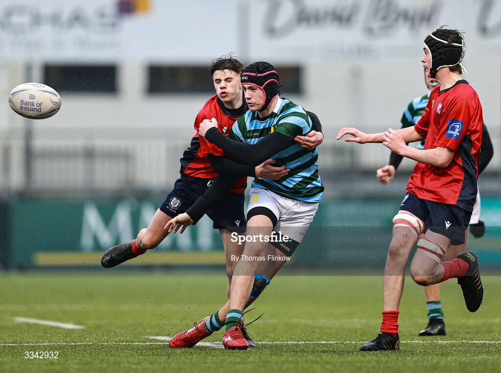 3 February 2026; Charlie Moes of St Gerard's School is tackled by Darragh Reid of CUS during the Bank of Ireland Leinster Rugby Boys Schools Junior Cup First Round match between CUS and St Gerard's School at Energia Park in Dublin. Photo by Thomas Flinkow/Sportsfile