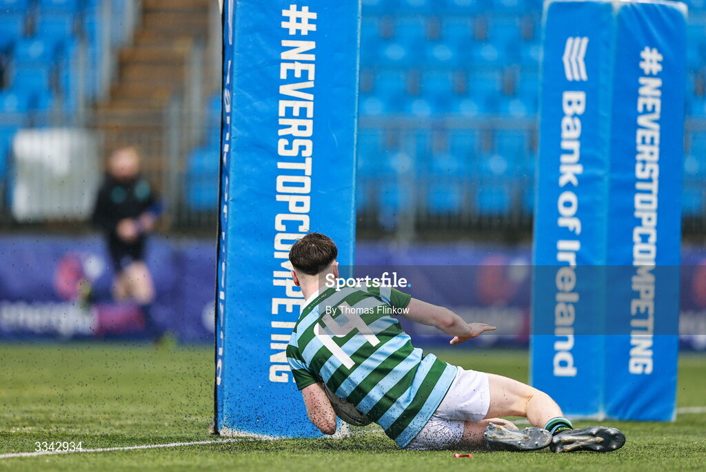 3 February 2026; Ben Willis of St Gerard's School scores a try during the Bank of Ireland Leinster Rugby Boys Schools Junior Cup First Round match between CUS and St Gerard's School at Energia Park in Dublin. Photo by Thomas Flinkow/Sportsfile