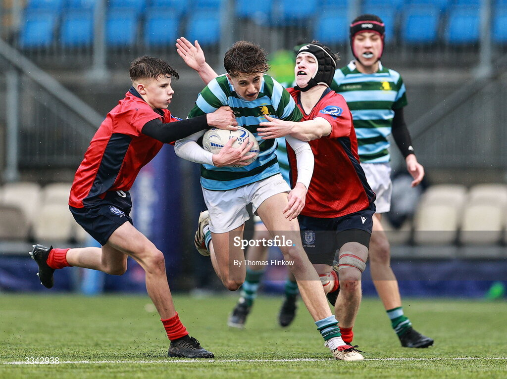3 February 2026; P.J. Cunningham of St Gerard's School in action against CUS players, from left, John Reid and Darragh Reid during the Bank of Ireland Leinster Rugby Boys Schools Junior Cup First Round match between CUS and St Gerard's School at Energia Park in Dublin. Photo by Thomas Flinkow/Sportsfile