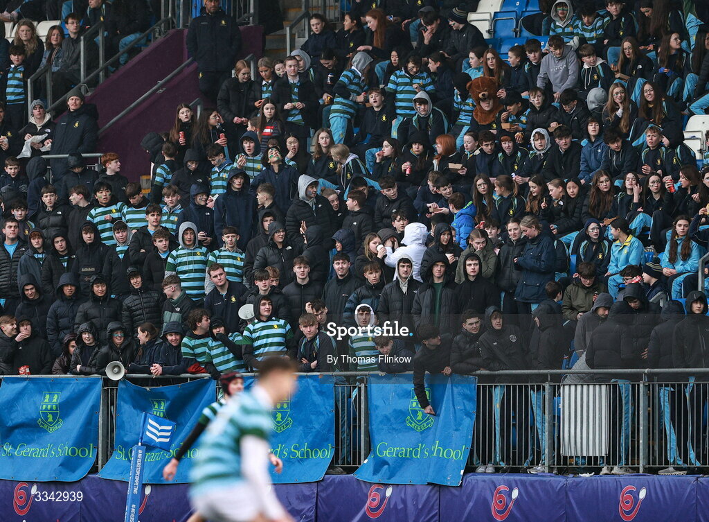 3 February 2026; St Gerard's School supporters during the Bank of Ireland Leinster Rugby Boys Schools Junior Cup First Round match between CUS and St Gerard's School at Energia Park in Dublin. Photo by Thomas Flinkow/Sportsfile