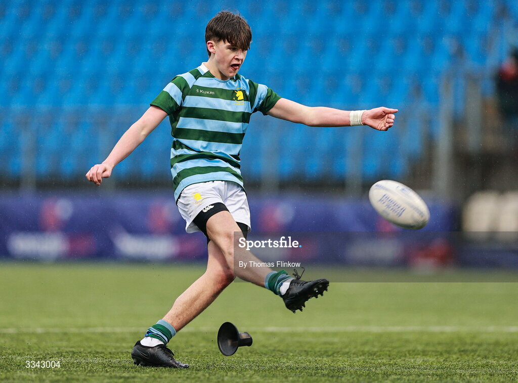 3 February 2026; Samuel Hegarty of St Gerard's School kicks a conversion during the Bank of Ireland Leinster Rugby Boys Schools Junior Cup First Round match between CUS and St Gerard's School at Energia Park in Dublin. Photo by Thomas Flinkow/Sportsfile