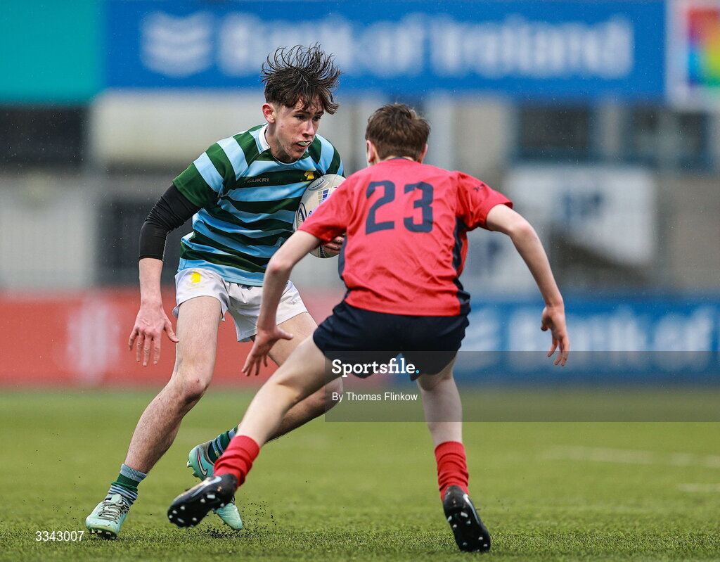 3 February 2026; Milees MacGreevy of St Gerard's School is tackled by Sean Ryan of CUS during the Bank of Ireland Leinster Rugby Boys Schools Junior Cup First Round match between CUS and St Gerard's School at Energia Park in Dublin. Photo by Thomas Flinkow/Sportsfile