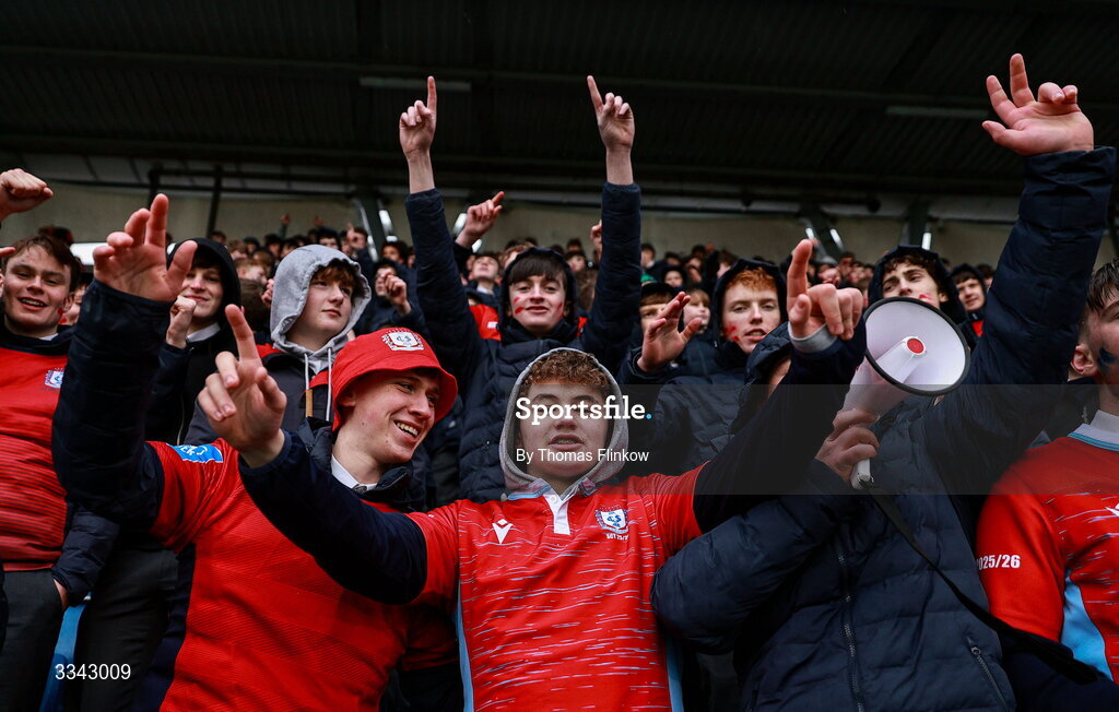 3 February 2026; CUS supporters during the Bank of Ireland Leinster Rugby Boys Schools Junior Cup First Round match between CUS and St Gerard's School at Energia Park in Dublin. Photo by Thomas Flinkow/Sportsfile