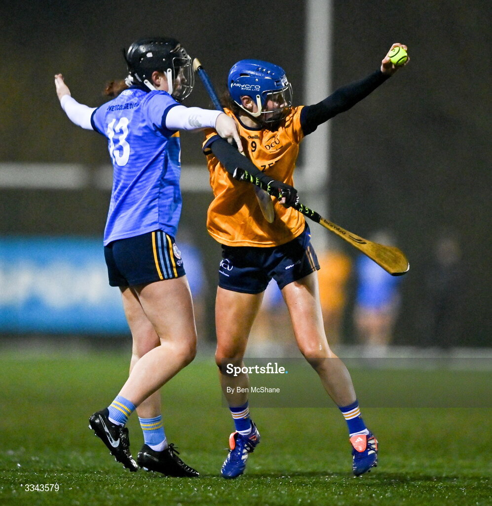 3 February 2026; Ellen Cuneen of DCU Dóchas Éireann is tackled by Ciara Shelly of University College Dublin during the Ashbourne Cup semi-final match between UCD and DCU at the DCU Sportsground in Dublin. Photo by Ben McShane/Sportsfile